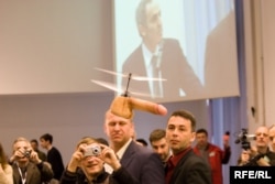 Но утечки информации избежать не удалось. Журналистов и делегатов встречал фаллический символ, указующий на место проведения собрания.