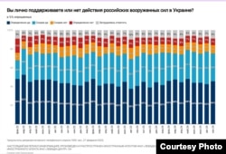 Аналитический центр Юрия Левады почти каждый месяц, начиная с марта 2022 года, исследует отношение россиян к войне в Украине. Последний общероссийский опрос по репрезентативной всероссийской выборке городского и сельского населения в 50 субъектах РФ прошел с 26 сентября по 2 октября.