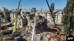 Пятиэтажный дом после удара, нанесённого утром в четверг, обрушился почти полностью. Всего повреждены, по данным властей, 225 жилых домов и другие объекты, включая представительство ЕС и киевское бюро Радио Свобода.
