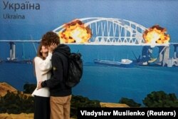 В Киеве установили макет почтовой марки с горящим Крымским мостом