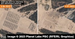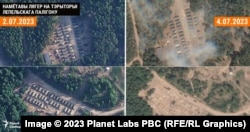 В частности, на фото, сделанном 4 июля 2023, лагеря на полигоне "Обуз-Лесновский" под Барановичами уже фактически нет. Спутниковые снимки показывают, что разбирать лагерь, сооруженный в октябре 2022 года, начали не раньше 30 июня.