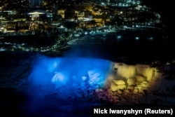 Величественная картина: "Американский водопад" и водопад "Фата", часть самого мощного в Северной Америке Ниагарского водопада, освещены цветами украинского флага