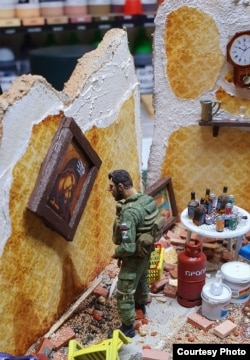 Живущий в Англии литовский художник Томас Упскас делает миниатюрные диорамы с политическими и историческими сюжетами. "Я изображаю солдат-мародеров не в первый раз, – рассказывает он Радио Свобода. – У меня была диорама с советскими мародёрами в Литве в 1944 году".
