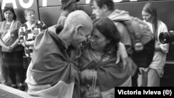 Из окна автобуса они видят радостную толпу встречающих: это все те, для кого война стала ощутимой на личном, частном уровне отдельной семьи – их родные мужчины ушли защищать Украину и пропали без вести или оказались в российском плену. Одни разворачивают огромные, чуть не в человеческий рост баннеры с именами и фотографиями сыновей, братьев, мужей, друзей, другие держат самодельные плакаты, а кто-то и просто тетрадные листы с фамилиями. Многие знакомы: принимают участие в постоянных акциях поддержки военнопленных - так они поддерживают и друг друга.