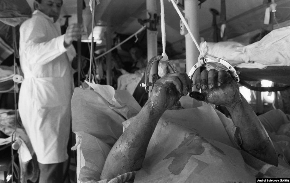 Медицинская сестра в уфимской больнице с жертвой катастрофы. Более 300 человек скончались в больницах из-за полученных ожогов в первые дни после трагедии.