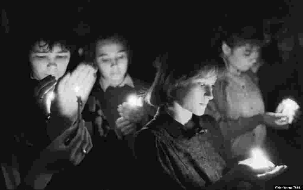 Родственники и друзья погибших на траурной церемонии в первую годовщину после трагедии, 4 июня 1990 года.
