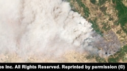 Этот месяц ознаменовался в Европе и Северной Африке еще одним катаклизмом – небывалой жарой и вызванными ей лесными пожарами, которые затронули Францию, Испанию, Португалию, Грецию. На этом снимке – дым от лесных пожаров в районе марокканского города Уэззан, запечатлённый спутником 14 июля.