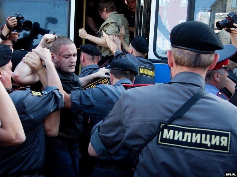 Как только Сергей Удальцов и его соратники достали "черные метки" для Юрия Лужкова, сотрудники милиции приступили к задержанию.